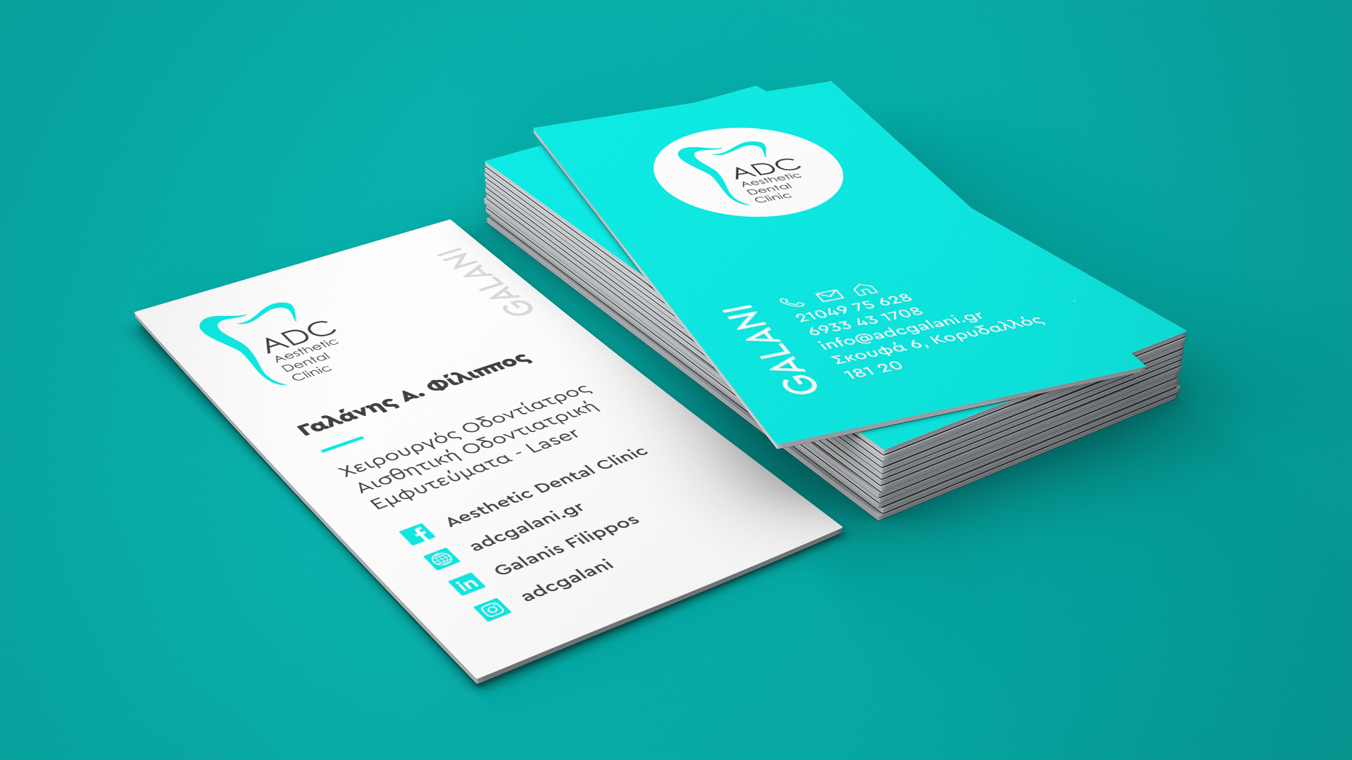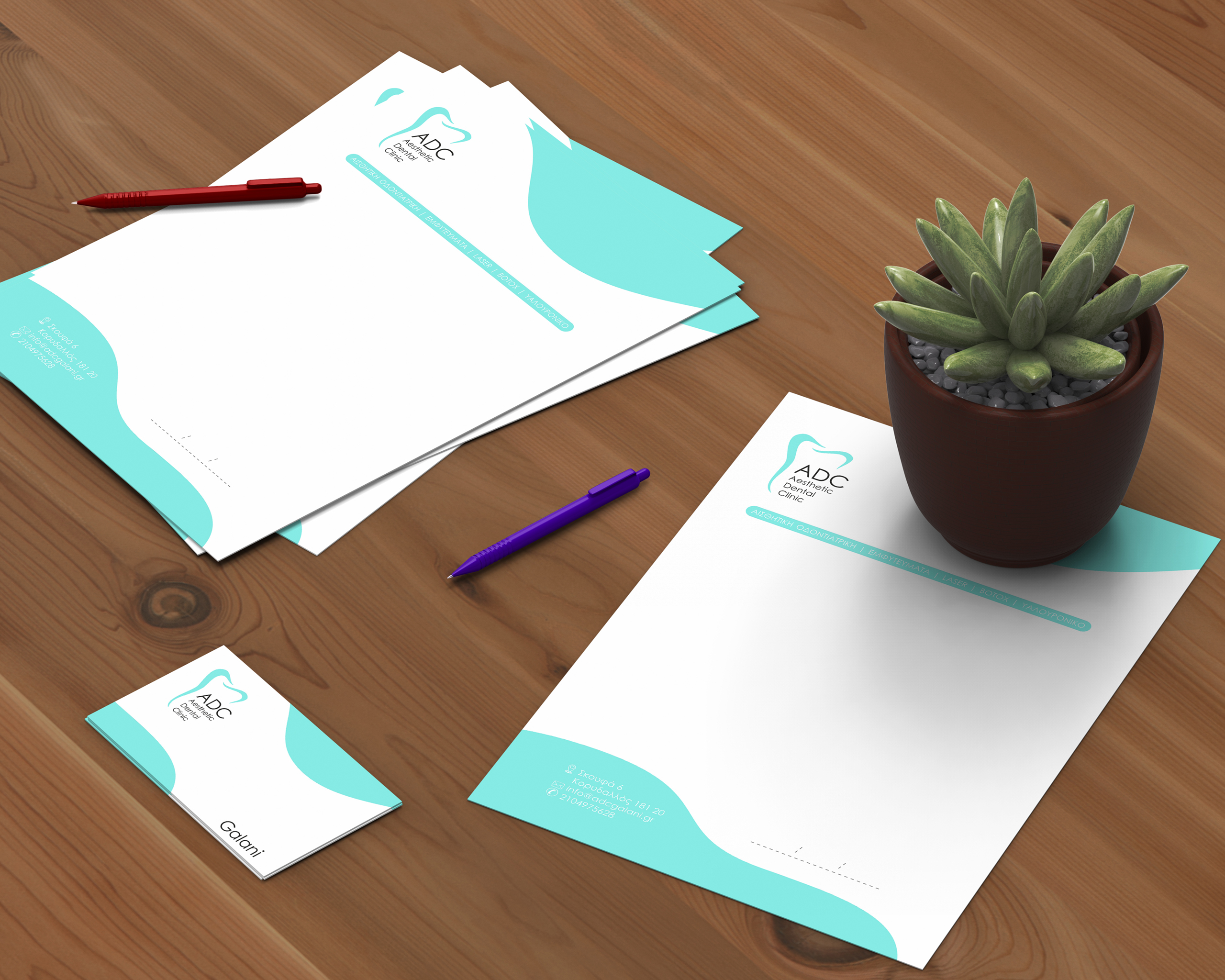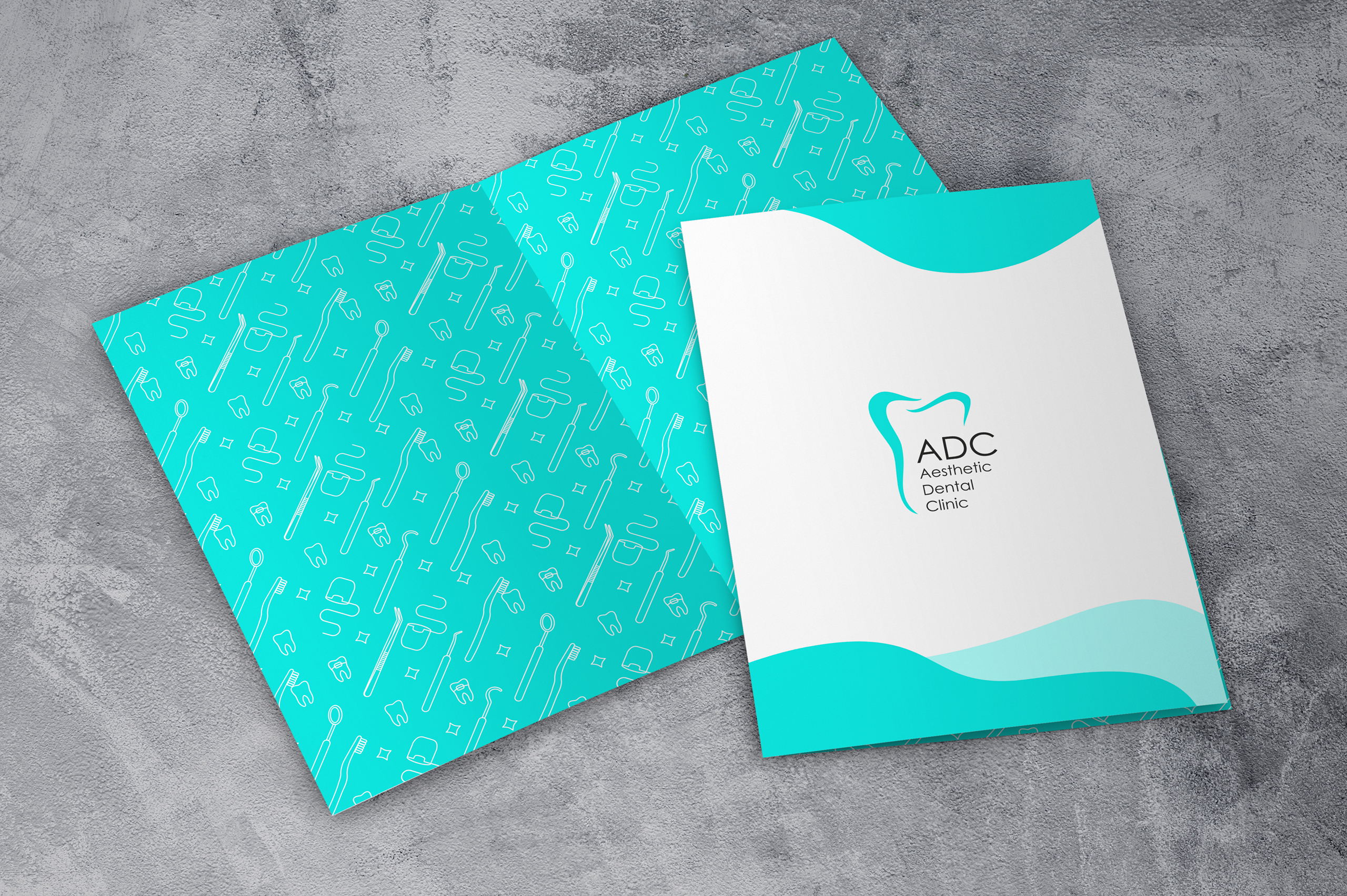 Corporate Identity Design für eine Zahnklinik. Karten, Broschüren, Rezeptbücher sowie Innen- und Außenbeschilderung.